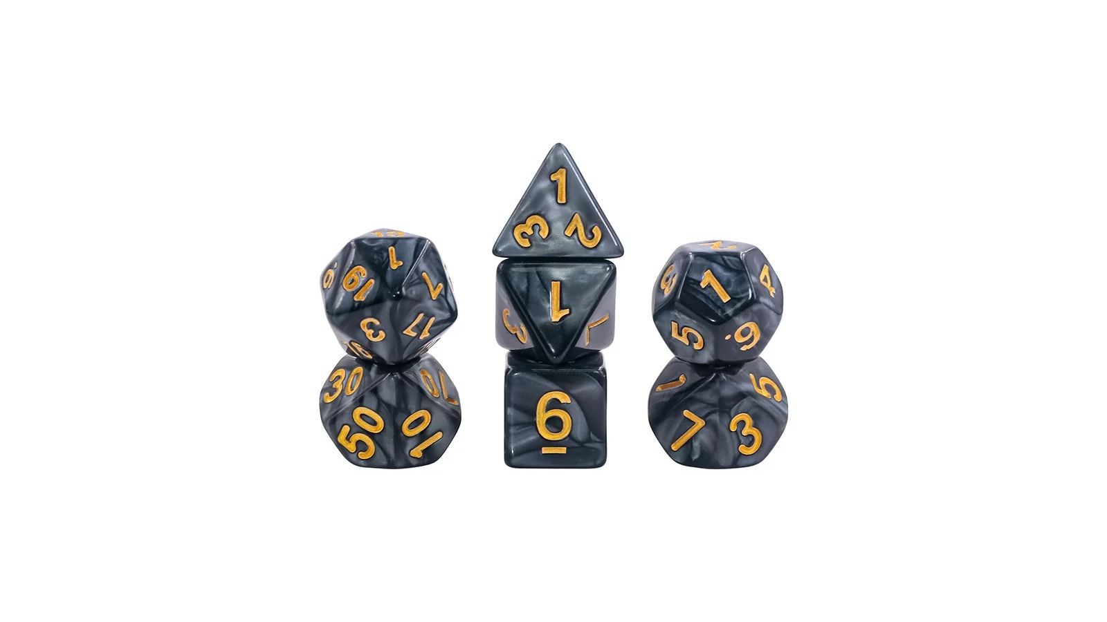 Ce lot comprend des dés de différentes formes et tailles, permettant une utilisation polyvalente dans divers jeux. Le noir nacré associé à des touches dorées apporte une élégance inégalée, rendant chaque lancer de dés encore plus excitant.