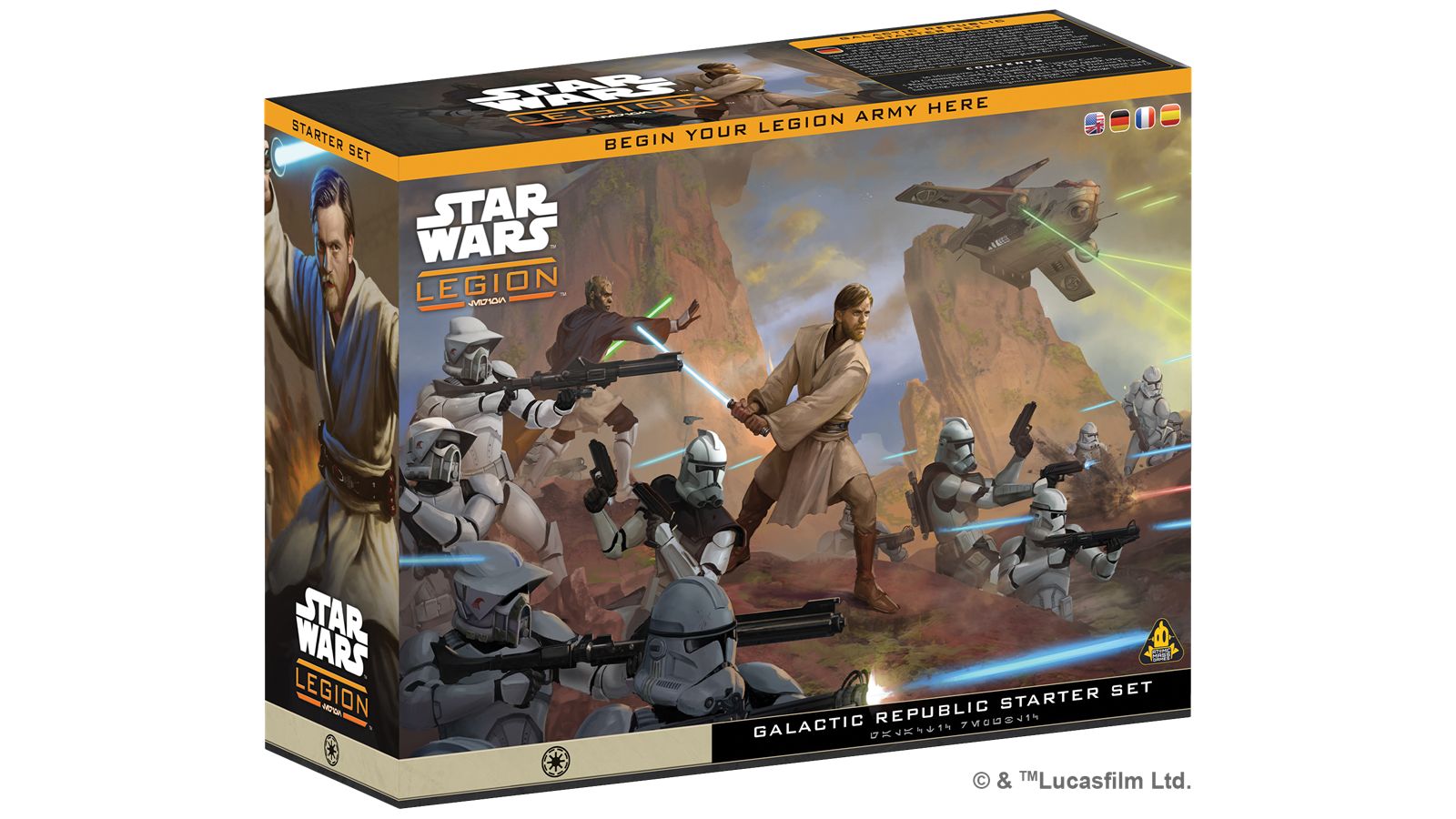 La République Galactique déploie son armée clone afin d’étouffer le soulèvement séparatiste et rétablir l’ordre dans la République. Allant là où l’envoie la République, le Général Obi-Wan Kenobi est le commandant d’une escouade de soldats clones d’élite. Habile tacticien, c’est aussi un utilisateur de la Force chevronné, ses prouesses stratégiques n’étant surpassées que par sa maîtrise approfondie des arts Jedi. Les soldats clones du Général Kenobi ont passé leur existence entière à s’entraîner afin d’agir en coordination les uns avec les autres, au sein d’une même unité. Leurs compétences martiales, stratégiques et défensives leur ont permis de repousser l’armée droïde, numériquement supérieure, lors de nombreuses batailles. Cette Boîte de Démarrage contient tout ce dont vous avez besoin pour commencer à jouer à Star Wars™: Legion. Les 36 figurines finement sculptées en plastique dur vous permettront de constituer 2 unités de Troopers et 2 unités de Forces Spéciales dirigées par Obi-Wan Kenobi.