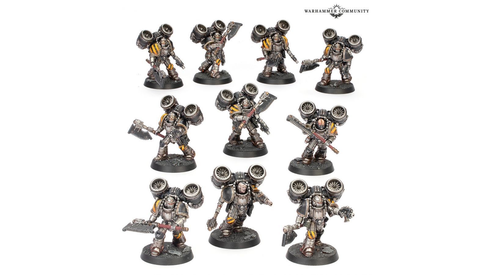 Chaque kit contient 10 Marines d’Assaut pouvant être équipés au choix de pistolets bolters ou de boucliers de combat dans leur main gauche, et le kit propose deux masses énergétiques, deux haches tronçonneuses lourdes, deux sets de bombes à fusion, deux pistolets désintégrateurs et un assortiment de grenades, de sacoches et d’autres éléments de personnalisation.*