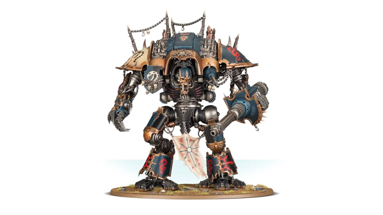 Le Knight Desecrator est un kit imposant à tout point de vue – il domine la plupart des figurines sur la table, et on peut le personnaliser grâce à un choix de heaumes à l'aspect agressif et de chaînes, conduites, pointes et cornes, de sorte à rendre votre Knight aussi maléfique que vous le souhaitez. On peut l'armer au choix d'une tronçonneuse Reaper ou d'un gantelet Thunderstrike, pour broyer quiconque survivrait aux salves de son destructeur laser.