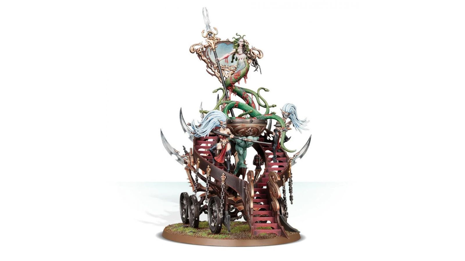 Deux Shrineguards frappent avec leurs longs aiguillons, tandis que la Medusa utilise sa Griffe-murmure, sa lance et son regard mortel pour massacrer l’ennemi. Si puissant que soit cet engin au corps à corps, il a une autre fonction, plus sinistre. Un étrange miroir appelé scáthmre se trouve au centre de l’autel, ne reflétant pas seulement le regard de la Bloodwrack Medusa, mais aussi une aura douloureuse, une projection ténébreuse de la haine ardente qui consume la monstrueuse créature serpentine.