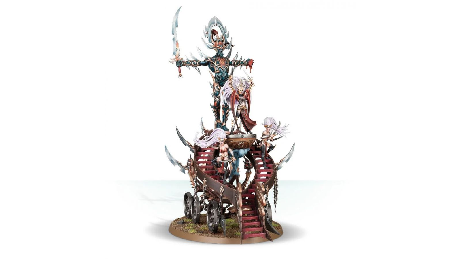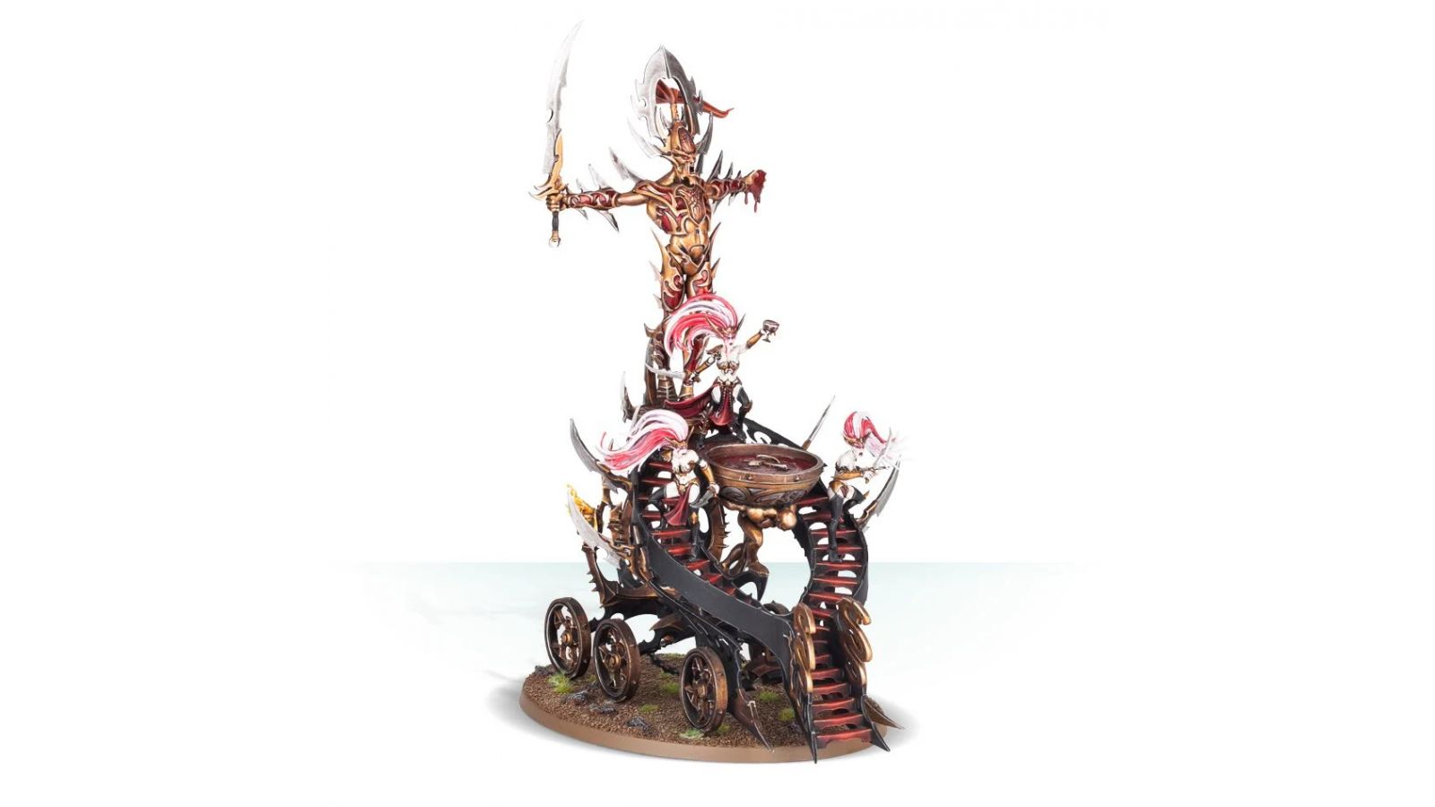 Ce kit plastique contient les composants nécessaires pour assembler un Bloodwrack Shrine. Un châssis de fer à six roues munies de lames forme la structure du kit, dont la base est garnie de pointes, de lames et de chaînes. À l'avant, un escalier orné d'icônes serpentines se divise pour monter sinueusement jusqu'au temple proprement dit. Il est sous la garde d'une Bloodwrack Medusa, une Witch Aelf qui a subi une transformation monstrueuse en créature à demi ophidienne munie d'une lance incarnate, et qui se tortille entre ses deux Shrinekeepers. Derrière elles, un grand miroir énigmatique – le scáthmre – encadré par d'élégantes décorations symétriques évoquant des serpents. Si on monte ce kit en tant que Bloodwrack Shrine, on peut également assembler une Slaughter Queen à pied, une Hag Queen à pied et un Avatar of Khaine.