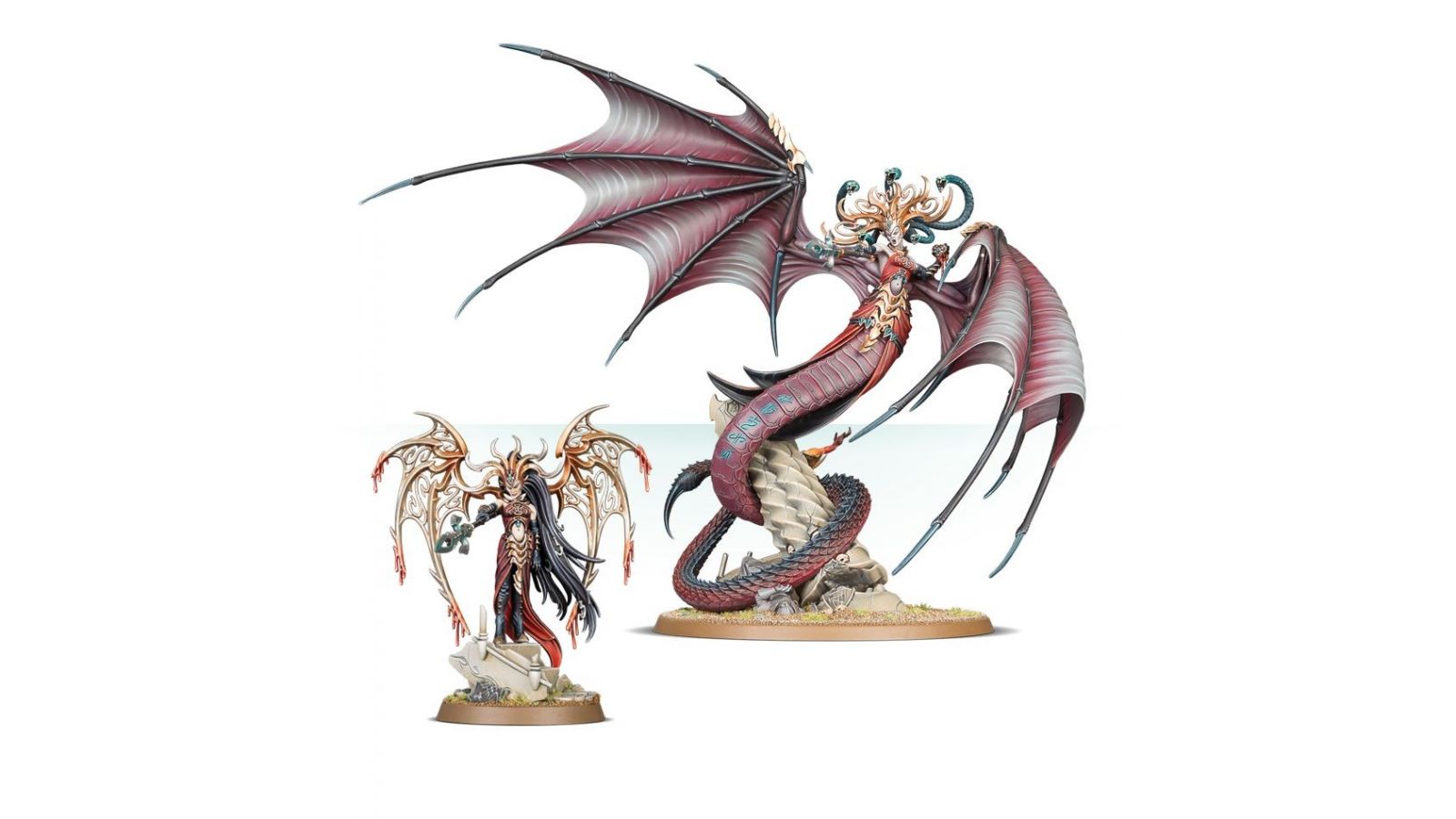 La Shadow Queen est une tout autre histoire – elle est presque trois fois plus haute avec une posture autrement plus agressive, ce qui en fait une splendide pièce centrale pour n'importe quel collectionneur de Daughters of Khaine. Sous cette forme, c'est son furieux aspect serpentin qui prédomine, car tout le bas de son corps est ophidien et enroule ses anneaux autour d'un épais pilier de pierre. Le haut du corps porte la même armure et la même coiffe tout en brandissant Écorche-cœur – mais sa chevelure est ici faite de serpents, et les ailes ont grandi démesurément sous une forme écailleuse, munie de pointes chitineuses promptes à empaler les imprudents. Le socle comporte une victime aelfe pétrifiée et cassée en deux par le regard de Morathi.