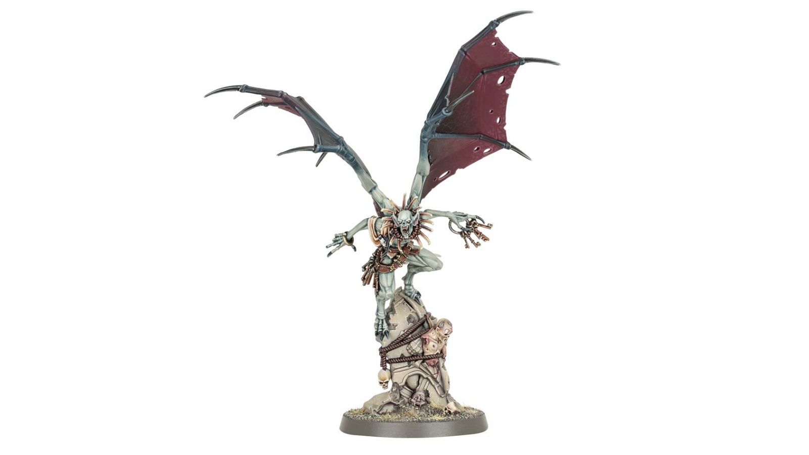 Ce kit plastique permet d'assembler une Sangtinelle Abhorrante, un margrave des Cours de Mangechairs. Cette gargouille terrifiante se laisse porter par les vents de Shyish sur ses ailes de cuir, et bondit de son perchoir pour survoler le champ de bataille et trouver sa proie. Sa silhouette monstrueuse est ornée d'une sinistre parodie des atours de la noblesse, et elle tient dans ses griffes acérées un trousseau de clés, symbole de son devoir royal.