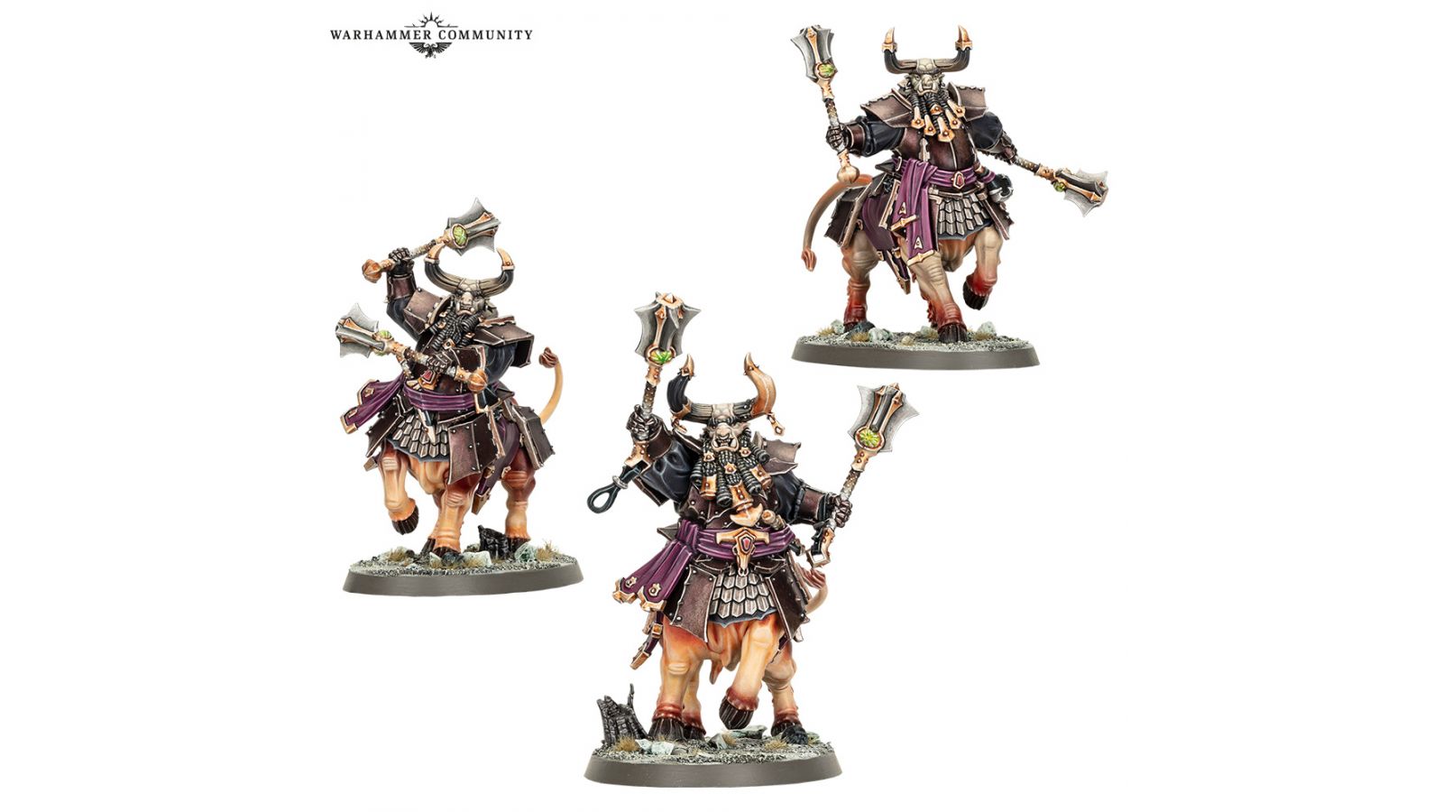 Cette boîte permet d’assembler trois Centaures-taureaux ou trois Sentinelles Consacrées, une race plus zélée d’individus élevés comme gardes des temples. Ceux-ci surveillent le champ de bataille et récitent les écritures tandis que les Forgeruines dévastent tout ce qui se dresse devant eux, en lançant de brutales contre-charges si leurs ennemis tentent de s’interposer. Les Centaures-taureaux ont quatre paires de cornes interchangeables, tandis que les Sentinelles Consacrées disposent de trois sets de masques interchangeables, et le kit s’accompagne également d’une planche de décalcos des Forgeruines de Hashut proposant 450 décalcos.