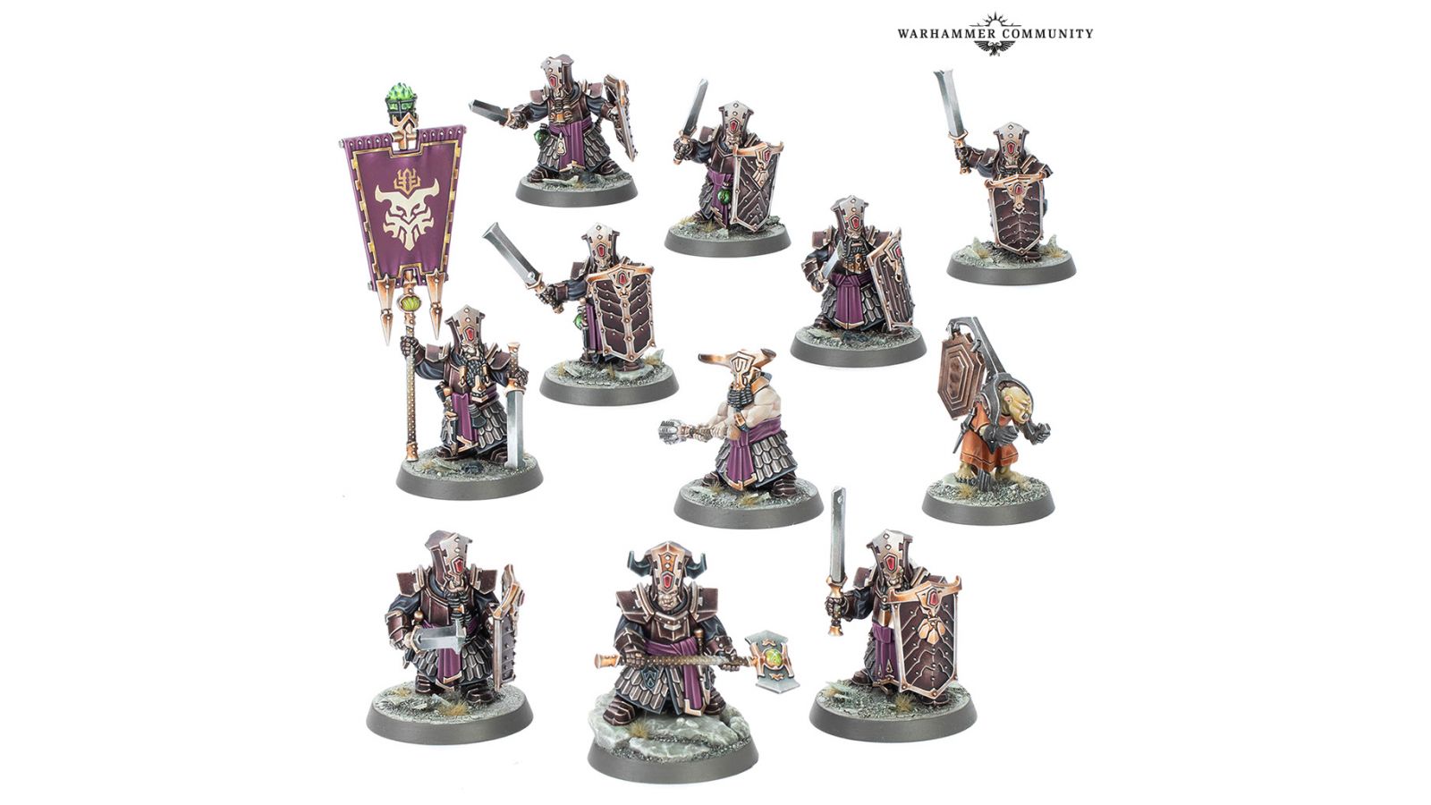 Cette boîte contient 11 figurines : 10 soldats des Cohortes Infernales et un hobgrot portant un gong. Un des duardins peut être assemblé comme champion armé d’un marteau et d’un bouclier, ou d’une hache à deux mains. Un autre peut être assemblé comme porte-étendard disposant d’un choix de trois têtes et trois sommets de bannière différents, et un dernier peut être assemblé comme musicien, dont l’assistant hobgrot dispose de deux options de têtes. Les figurines de Cohortes Infernales standard disposent de bras gauches interchangeables entre toutes, ainsi que de boucliers également interchangeables. Cette boîte contient aussi une planche de décalcos des Forgeruines de Hashut proposant 450 décalcos.