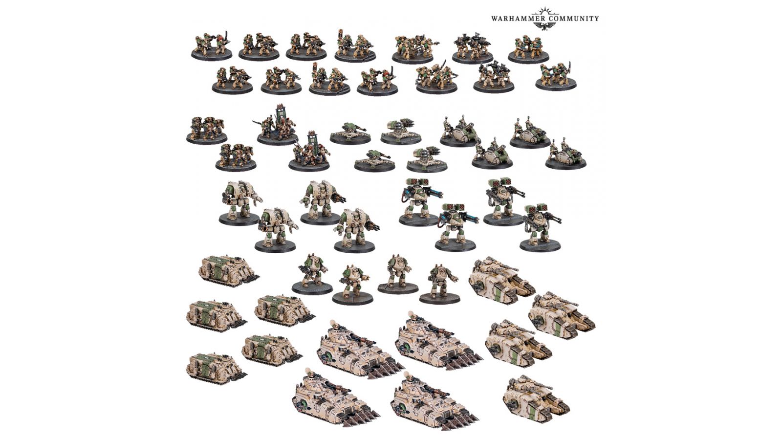Les Solar Auxilia furent présents lors de l’intégralité de l’Hérésie d’Horus, et vous pouvez débuter votre propre armée, étendre votre collection, ou vous essayer à mobiliser un Détachement Allié grâce à cette boîte de Force de Combat qui contient deux socles de Solar Auxilia Command, huit socles d’Auxilia, quatre socles d’Auxilia avec lance-flammes, quatre socles de Veletarii, quatre socles de Charonite Ogryns, quatre Aethon Heavy Sentinel, douze Auxilia Tarantula, douze Auxilia Rapier, quatre véhicules de démolition Cyclops, trois transports Dracosan, huit Leman Russ Vanquisher, et deux Auxilia Baneblade. La boîte contient aussi trois planches de décalcos des Solar Auxilia, comprenant chacune 288 décalcos.