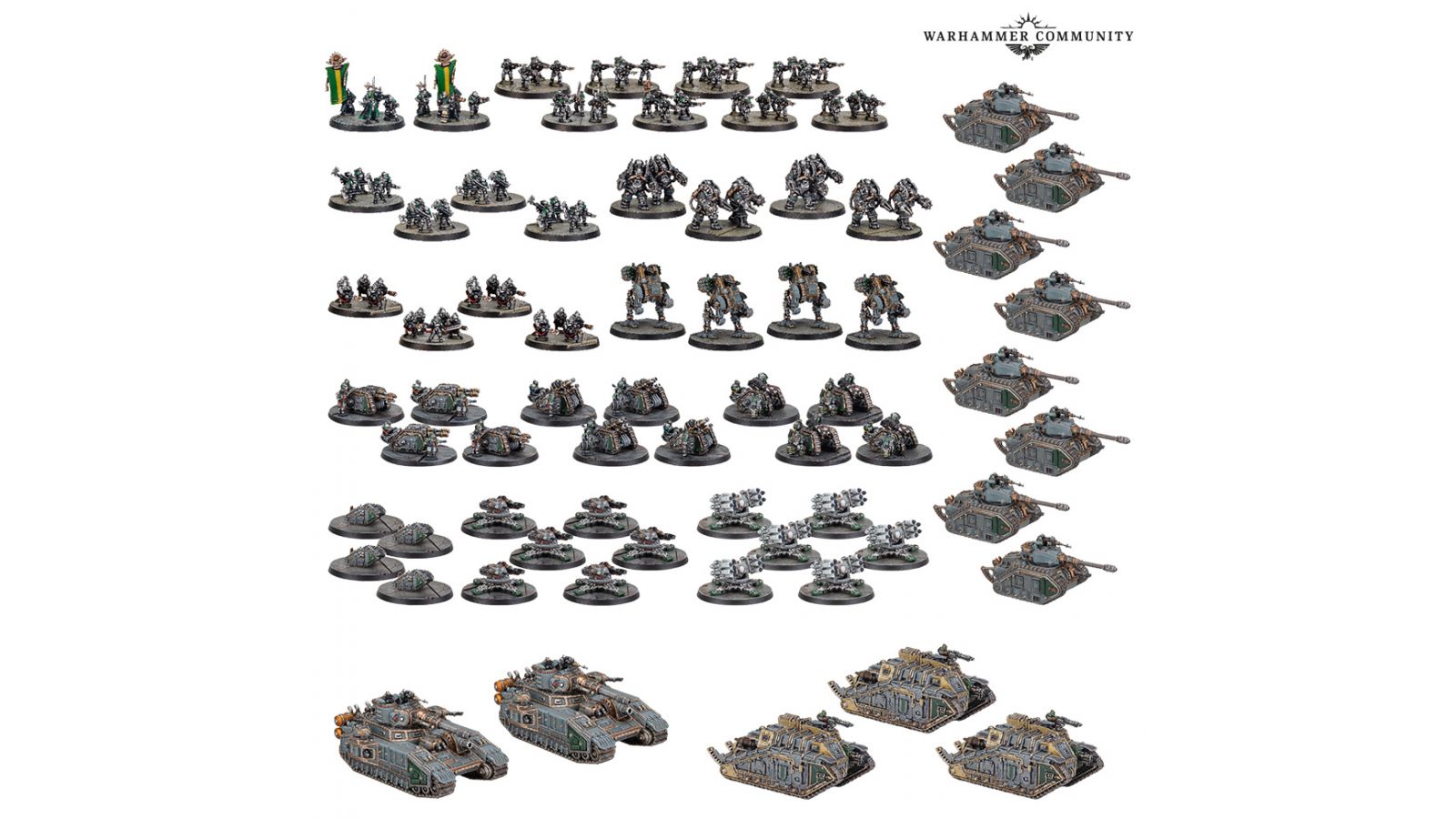 Cette boîte bien fournie, de 131 figurines individuelles, permet d’assembler deux Legion Command Squads, huit socles de Tactical Legionaries, deux socles de Legion Terminators, deux socles d’Assault Marines, deux socles de Support Legionaries, deux socles de Heavy Support Legionaries, quatre Contemptor Dreadnoughts, quatre Leviathan Dreadnoughts, quatre Deredeo Dreadnoughts, quatre Rapier, quatre Tarantula, cinq transports Rhino, quatre chars Kratos et quatre chars Sicaran. Elle s’accompagne de trois planches de décalcos des Véhicules des Legiones Astartes, proposant chacune 1130 décalcos.