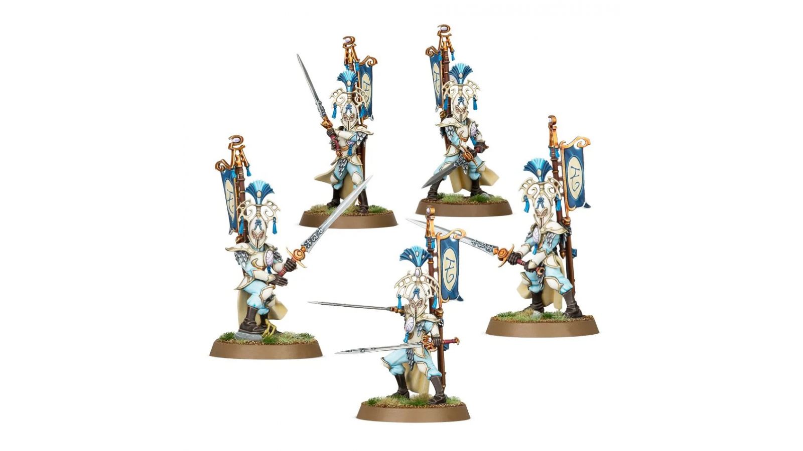 Armés de grandes lames de métal solaire et surnaturellement habiles, les Bladelords opposent un véritable tourbillon de lames à quiconque ose se mesurer à ces maîtres des arts martiaux. Vous pourrez choisir entre deux styles de combat en fonction de l'adversaire, des coups puissants à la précision sans faille aux déluges d'acier pour faucher les hordes denses. Leurs bannières dorsales, conférées par les Scinari et tissées de fil enchanté, les garantissent contre les sortilèges adverses pour qu'ils couvrent d'autant mieux leurs protégés.