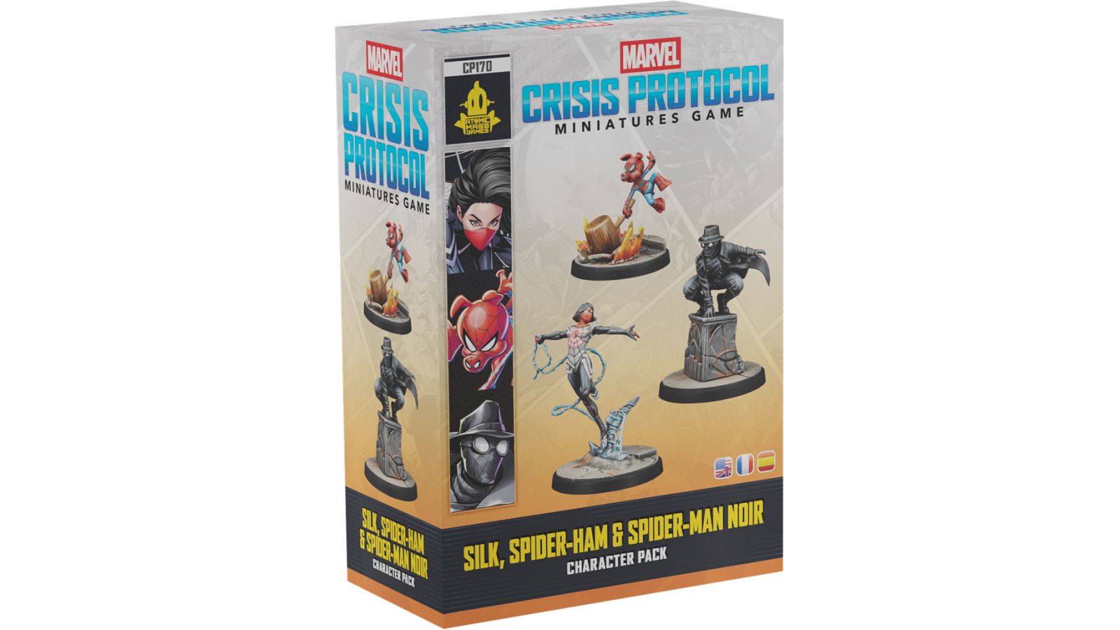 Ce set pour Marvel : Crisis Protocol, le jeu de figurines, contient trois nouvelles figurines, des cartes Statistiques et des cartes Tactique d’Équipe pour trois héros singuliers, Silk, SpideHam et Spider-Man Noir.