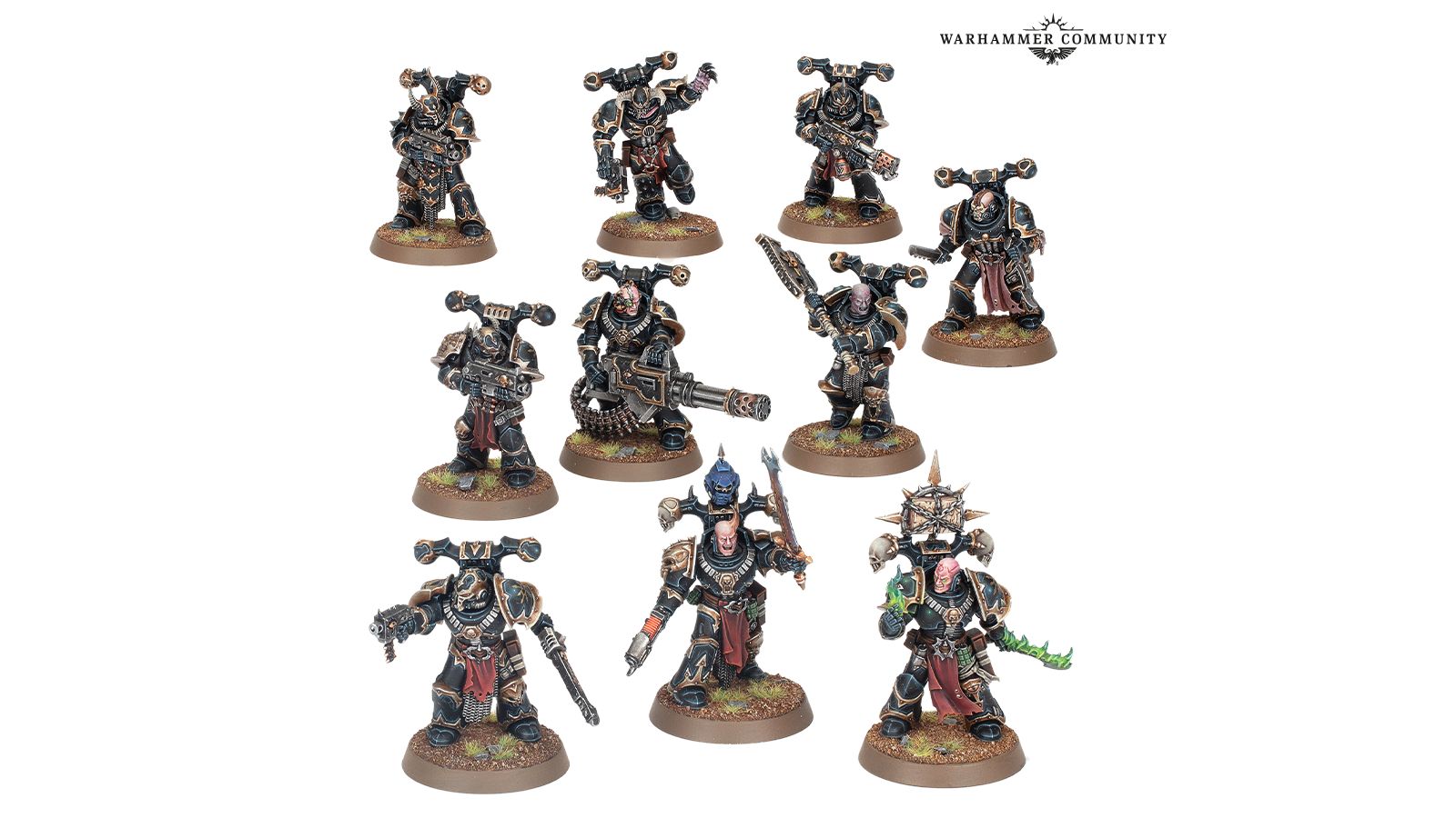Le kit de Légionnaires Space Marines du Chaos permet d’assembler une unité de 10 terrifiants guerriers de l’Hereticus Astartes, avec 18 options de têtes, 22 épaulières interchangeables et un assortiment d’armes lourdes et spéciales, ainsi qu’assez d’éléments pour équiper l’escouade pour le combat à distance ou rapproché. La boîte contient une planche de décalcos des Space Marines du Chaos.