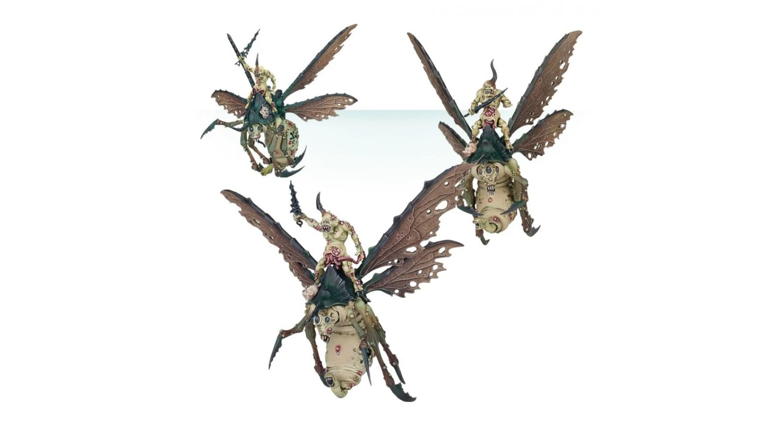 Ces contremaîtres du royaume de Nurgle traversent le plan des mortels sur des mouches à peste, d’imposants insectes démoniaques dont l’apparence répugnante choque l’esprit.