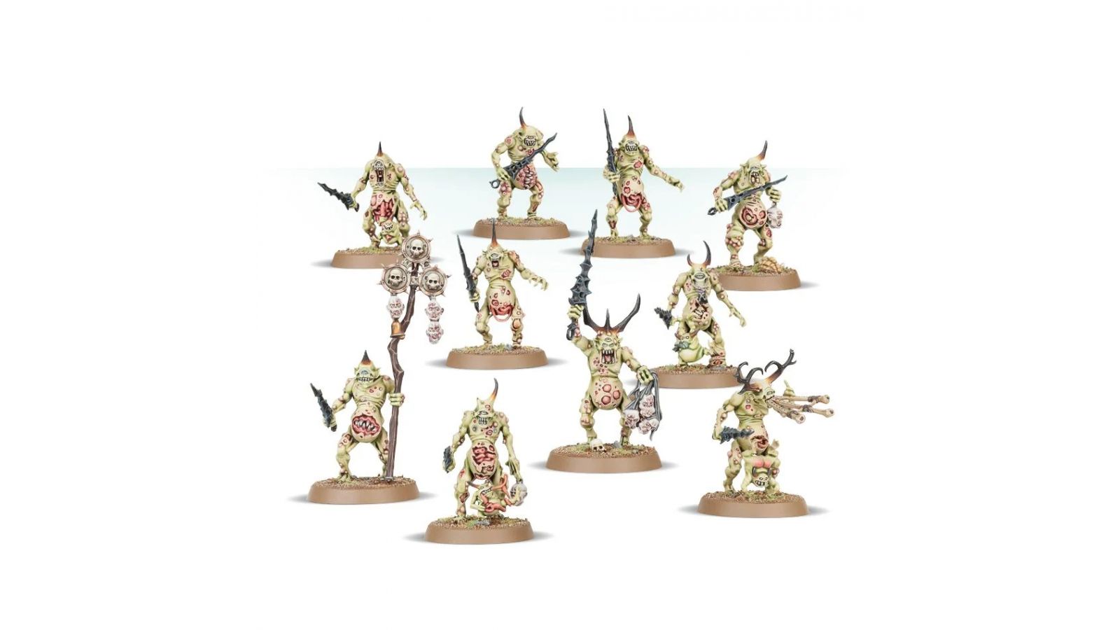 Ce kit plastique contient 74 pièces permettant d'assembler dix Plaguebearers de Nurgle. Il inclut de quoi assembler un état-major, y compris un Herald of Nurgle, un porte-étendard et un musicien. Fourni avec 10 socles ronds Citadel de 32mm.