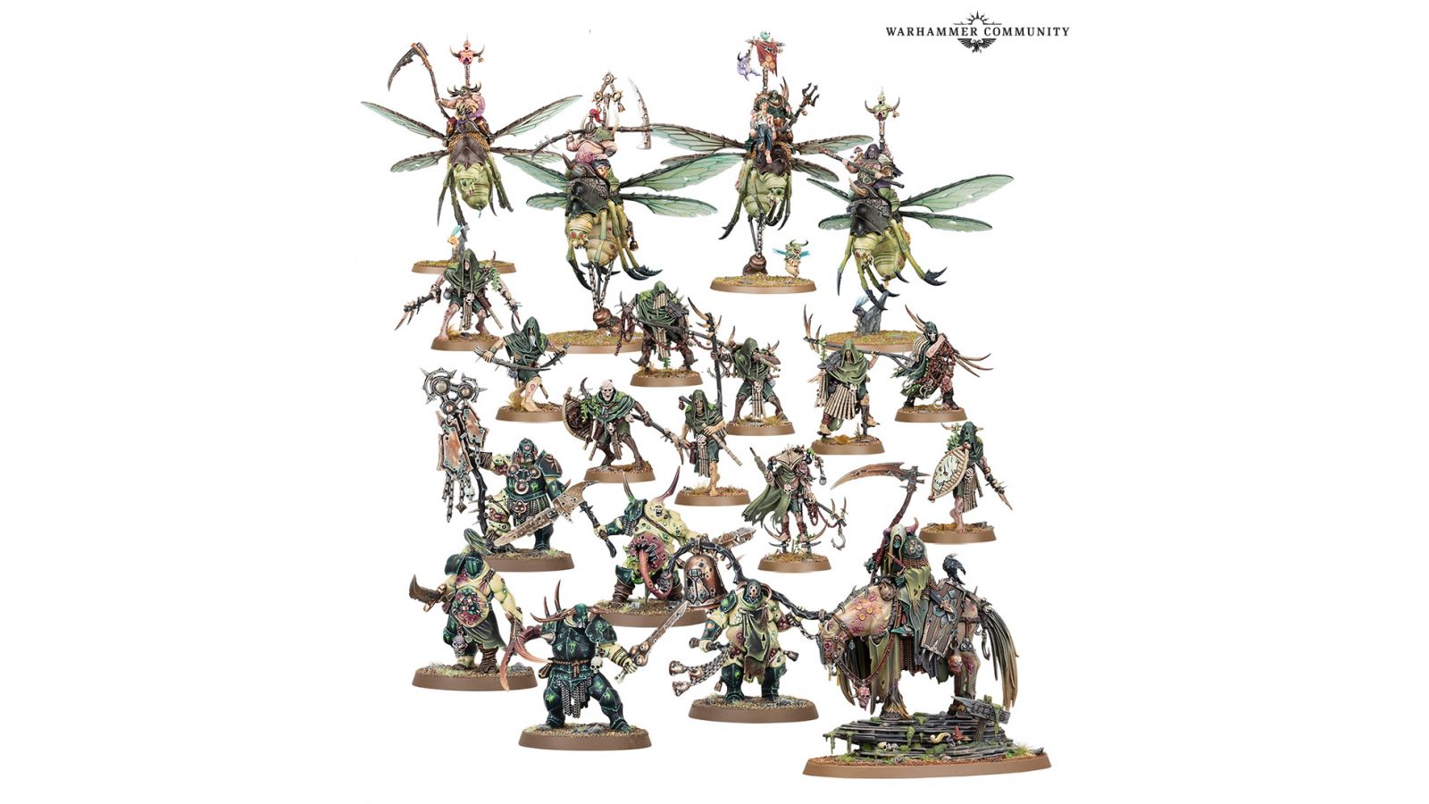Les Putrescents de Nurgle titubent depuis les désolations fétides, bénis par les boursouflures impies de leur divinité tutélaire. Où qu'ils aillent, les maladies se répandent sans entrave et des armées entières sont infectées par les dons généreux de Nurgle. Ils sont l'entropie incarnée, car leur dieu patient sait que toute vie finira par se décomposer.