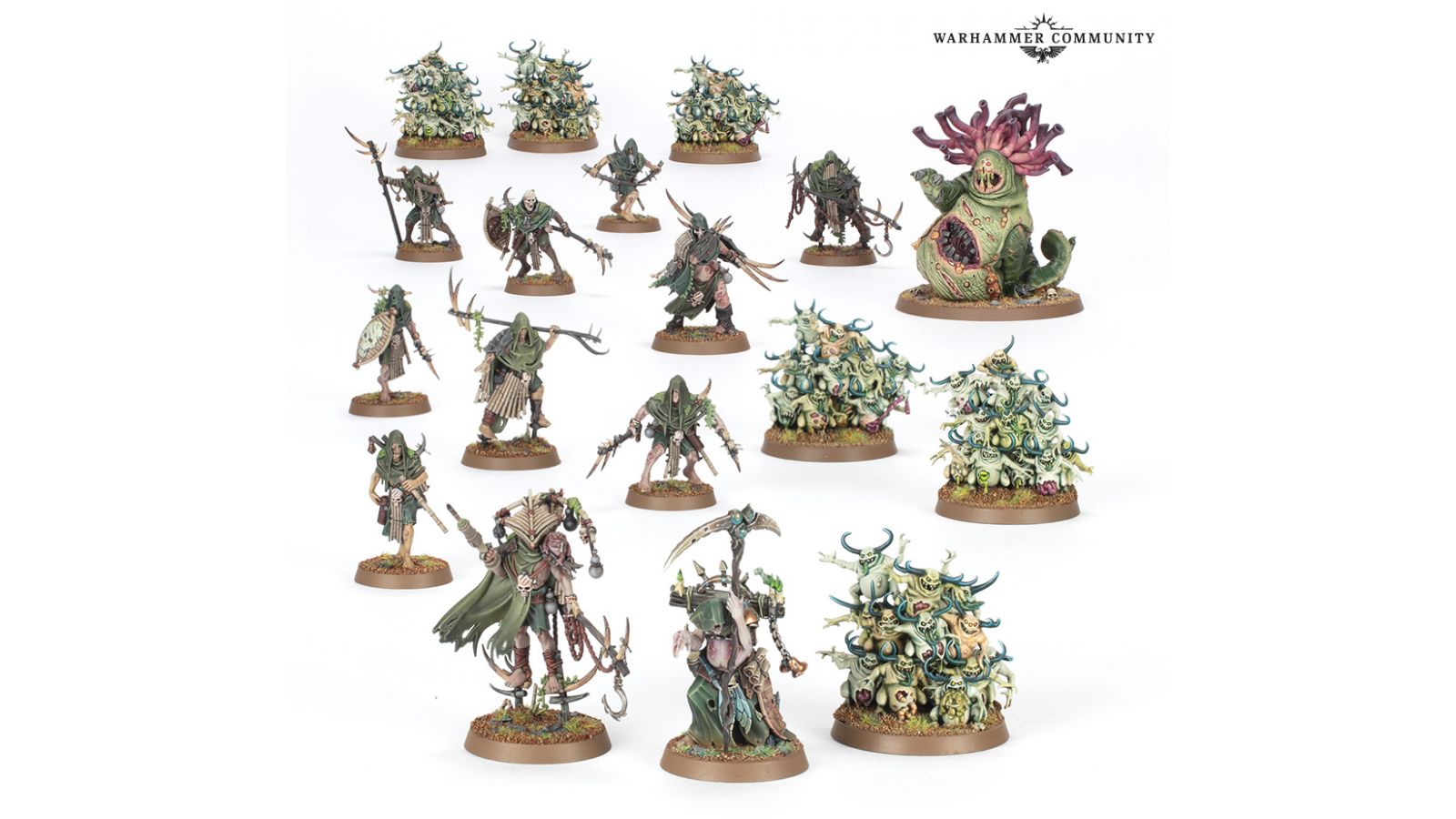 Répandez la contagion dans l’arène du Fer de Lance avec la Cellule Bubonique, menée par un terrible Sorcier Gangreneur et sa congrégation du Credo de Putrefange composée de 10 guerriers mortels. Deux groupes de trois nuées de Nurglings batifolent et griffent joyeusement l’ennemi dans leur sillage, tandis qu’une corpulente Bête de Nurgle se tient prête à balayer des régiments entiers de soldats dans sa quête d’un petit compagnon de jeu**.