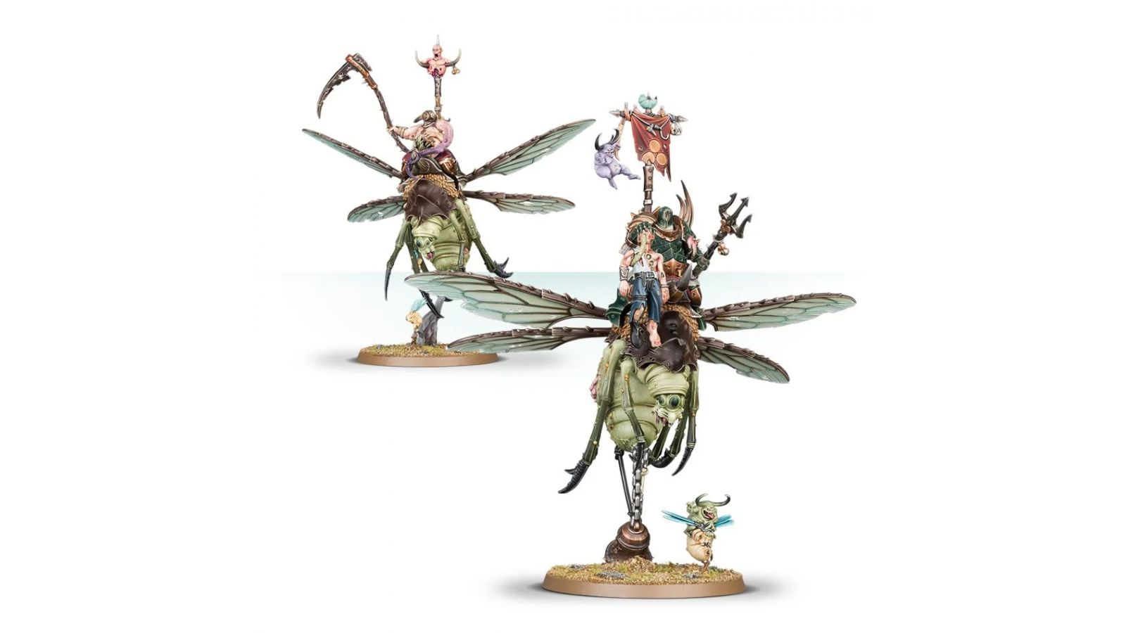 Ce kit plastique contient les composants nécessaires pour assembler 2 Pusgoyle Blightlords. Chacun d'eux chevauche une énorme Rot Fly, un insecte repoussant aux quatre ailes diaphanes, qui bourdonne dans le ciel en dégouttant de liquides immondes et corrosifs. Ce genre de mouche pestiférée a de longs membres grêles mais un abdomen bouffi, des yeux trop nombreux et des mandibules horribles. Les Blightlords sont quant à eux ignobles – il y en a un qui a une gueule béante dans le ventre, et l'autre est affligé de varices, de tentacules et d'icônes de Nurgle. Les deux figurines ont une perche attachée dans le dos, qu'on peut munir d'une bannière de toile, d'un symbole de Nurgle en métal, ou encore (et c'est quelque chose) un cadavre empalé pourri et exprimant la souffrance brute. Le duo est muni d'armes corrodées massives, faux ou trident, et on peut lui mettre des têtes nues ou couvertes affreusement détaillées. Il y a trois compagnons Nurglings – un avec encensoir, un chevauchant une petite mouche à peste, et le dernier mâchouillant gaiement ses propres intestins…