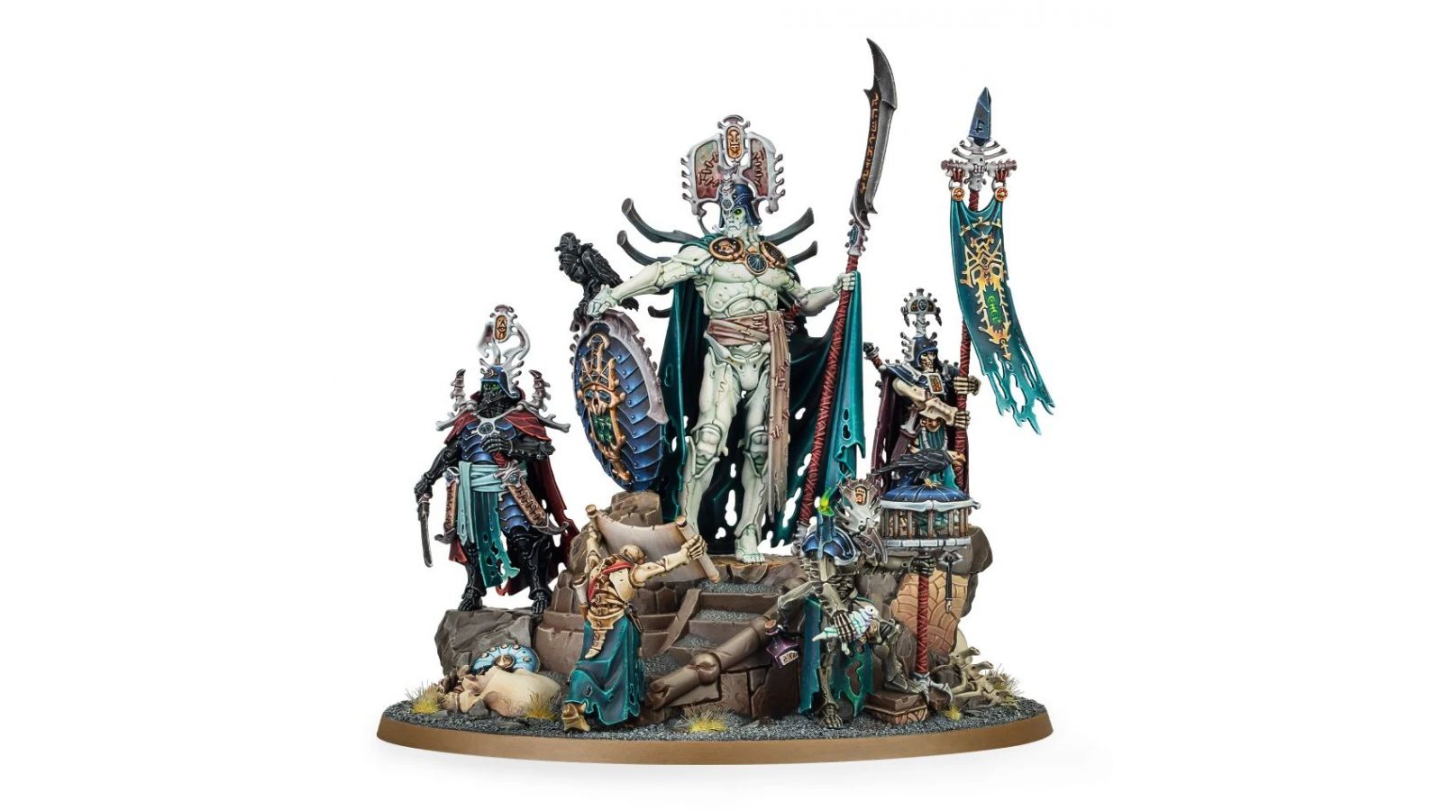 Katakros se dresse au centre d'un socle sculpté, entouré de sa suite de fidèles, le Prime Necrophoros, le Liege-Immortis, le Gnosis Scrollbearer et l'Aviarch Spymaster. Armé d'Inda-Khaat et du Bouclier Immortis, il les domine tous de sa grande taille. Il fait une pièce centrale toute trouvée pour n'importe quelle armée d'Ossiarch Bonereapers.