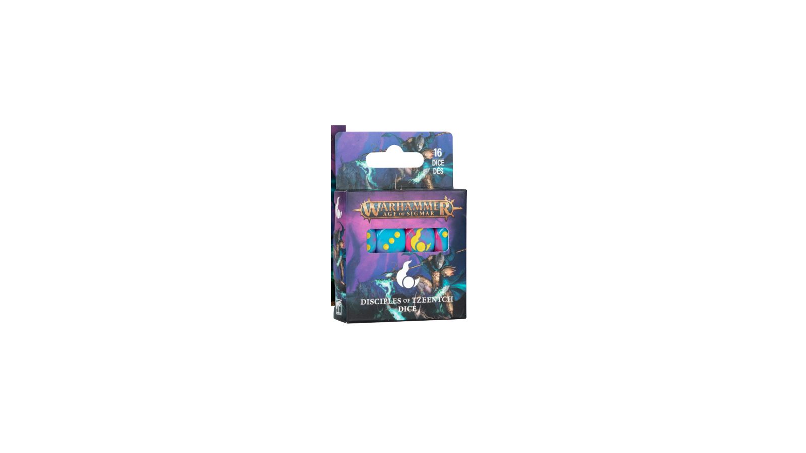 Vous pouvez également afficher votre dévotion envers Tzeentch grâce à un set de 16 dés à volutes bleus et roses avec des marquages jaunes et l’icône de la faction sur la face du 6.*
