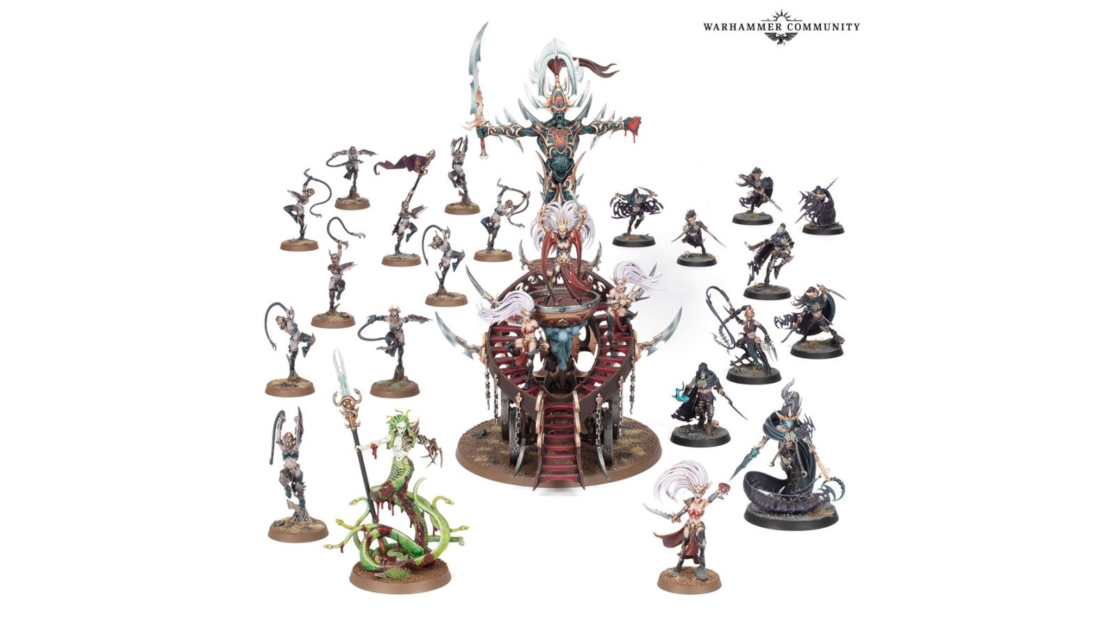 Amorcez vos premiers bains de sang sur les champs de bataille avec une nouvelle force regorgeant d’aelfes meurtrières, la Coterie de l’Ombre Khainite. Ce Fer de Lance rapide et redoutable s’agglomère autour d’une Reine du Massacre sur Chaudron de Sang (l’une des figurines les plus grandes et les plus impressionnantes jamais vues dans ces affrontements à l’échelle modeste), et se compose d’une Reine Matriarche, d’une Méduse Incarnate, de neuf Rôdeurs de l’Ombre Khainites et de 10 Sœurs du Massacre.