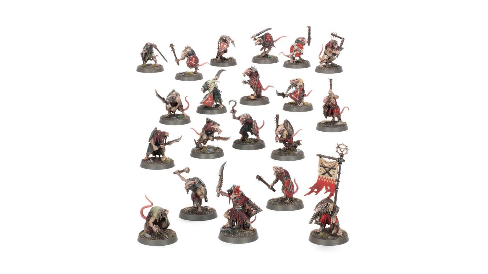 Ce kit en plastique permet d'assembler pas moins de 20 Rats des Clans, des guerriers médiocres mais qui constituent les hordes innombrables des Skavens. Leur assortiment d'armes rouillées leur permet de porter également un bouclier. Deux des 20 figurines peuvent être assemblées comme Champions. L'un d'eux dispose de trois options de tête, représentant les Clans Eshin, Pestilens et Verminus, et l'autre Champion a deux options: une pour les Clans Verminus et l'autre pour les Clans Skryre. Jusqu'à deux figurines peuvent être assemblées comme Porte-étendard, et deux autres peuvent représenter des Musiciens. Avec toutes les poses uniques, une grande variété d'armes et différents styles de boucliers, vos masses grouillantes auront l'apparence d'une nuée hétéroclite de rats galeux: parfait pour de grandes armées comptant plusieurs unités.