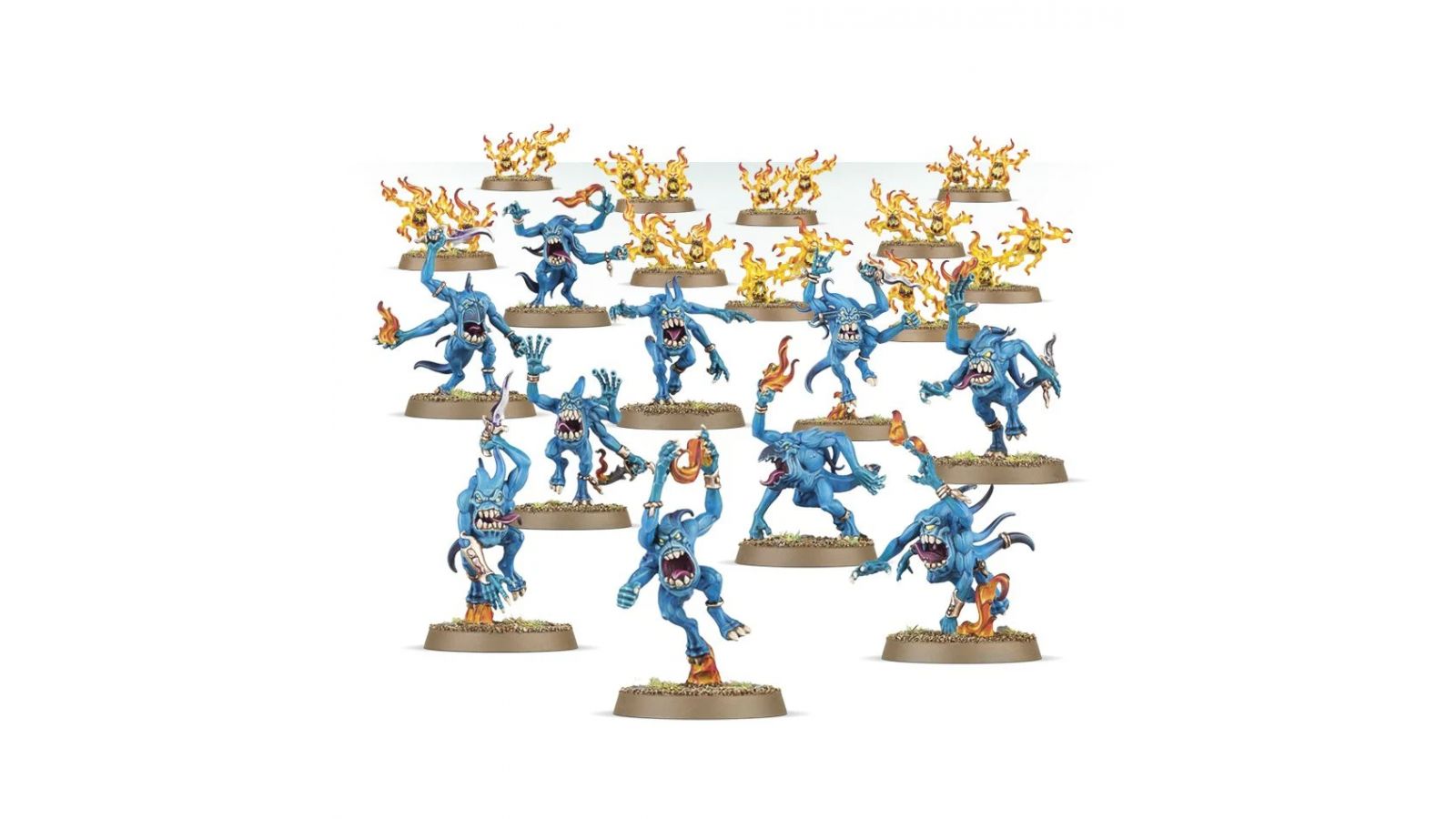 Ce kit plastique contient les composants nécessaires pour assembler 10 paires de Brimstone Horrors of Tzeentch. Ces petites créatures de malfaisance pure dansent sur leur socle telles des flammèches. Il y a également les composants requis pour monter 10 Blue Horrors of Tzeentch. Le regard plein fureur, la gueule hérissée de crocs, certaines tendent les griffes pour lacérer l'ennemi, d'autres manipulent des flammes magiques qui dansent au bout de leurs doigts. Bardées d'ornements,de joaillerie et de plumes, elles comportent aussi des flammes pour agrémenter leur socle.