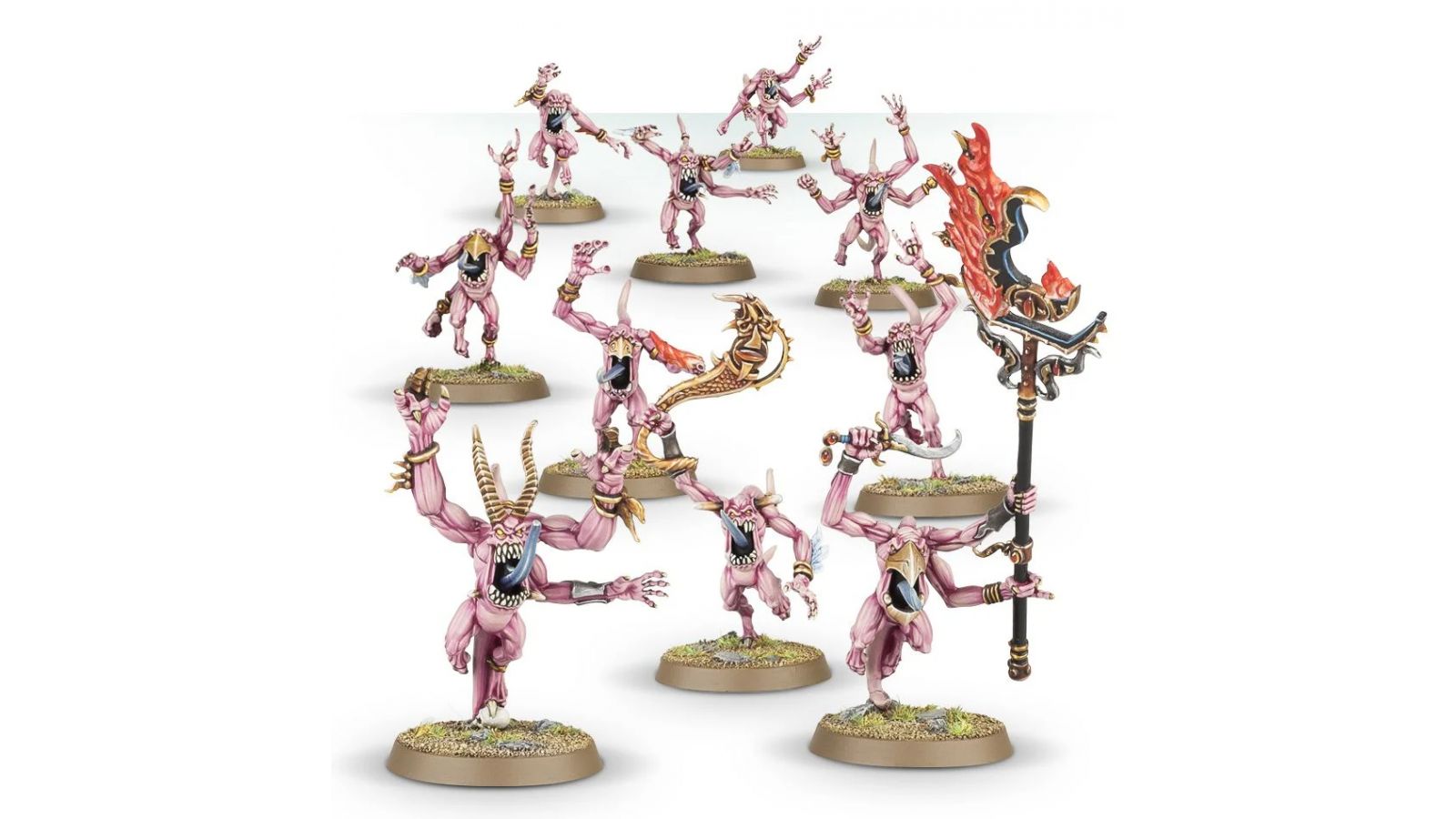 Ce kit de dix Pink Horrors en plastique aux membres multiples propose tout le nécessaire pour assembler une sonneuse de cor, une porte-icône (à l'immense emblème ardent de Tzeentch) et une Iridescent Horror, championne d'unité prompte à donner la mort de ses propres mains.
