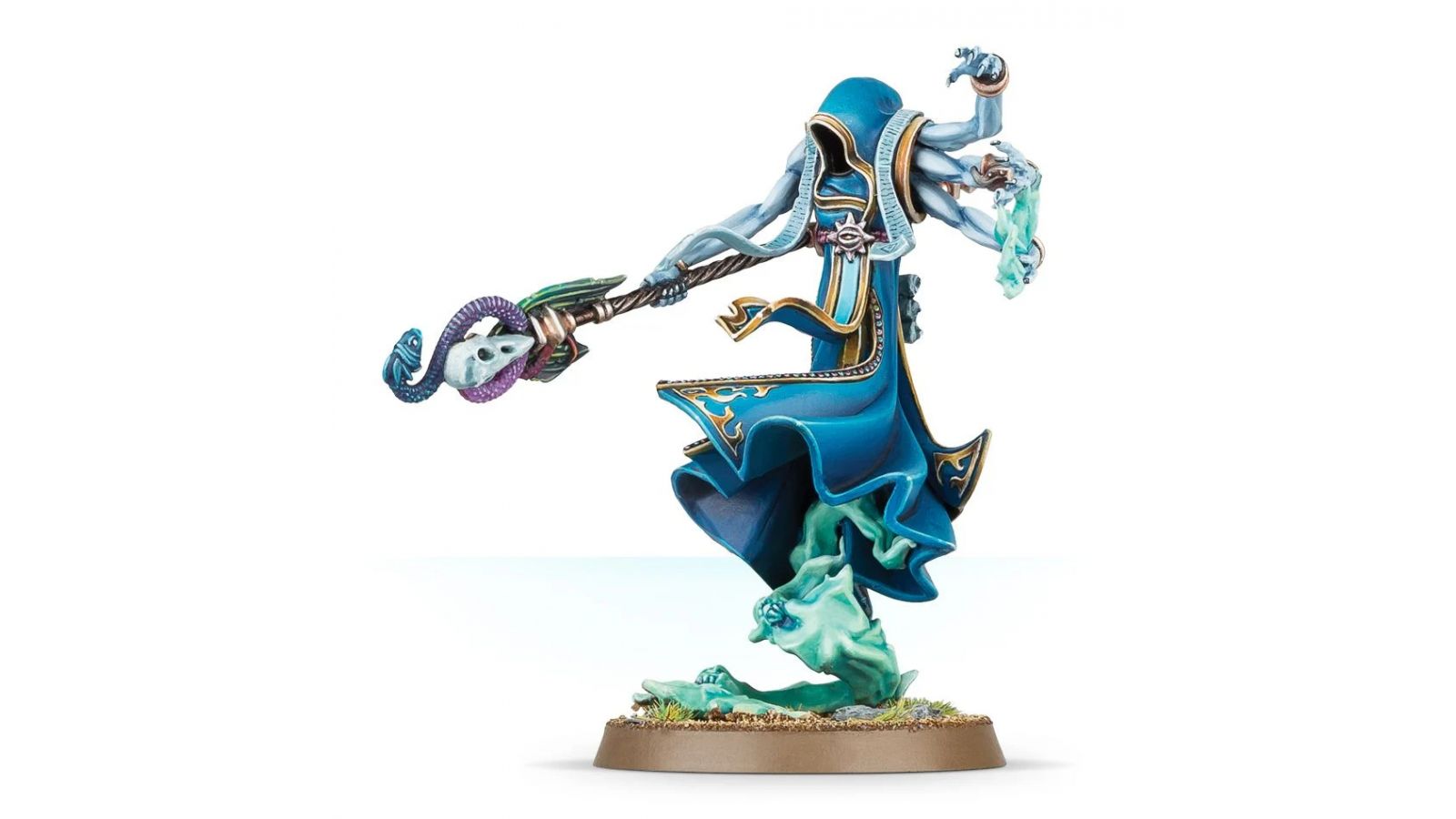 Ce kit plastique contient les composants nécessaires pour assembler un Changeling. Nanti du Bâton du Trompeur surmonté d'un serpent sinistre, il tend ses trois autres bras vers sa gauche pour incinérer un malheureux ennemi dans les flammes du Warp. Muni de trois parchemins énigmatiques, il porte un manteau dont la capuche masque ses traits, et il s'élève au-dessus de son socle sur des flammes magiques.