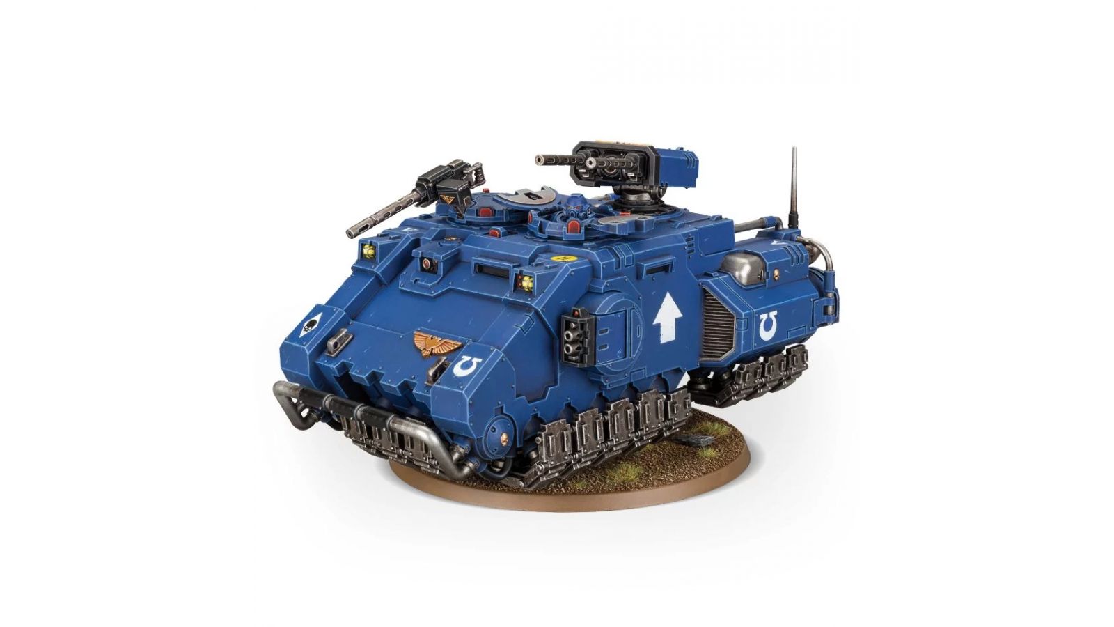 Le kit comprend 108 composants avec l'ensemble des options d'armes et d'équipement de l'Impulsor. La figurine est fournie avec un socle rond Citadel de 100mm et une tige transparente, plus une planche de décalcomanies Ultramarines pour véhicule.
