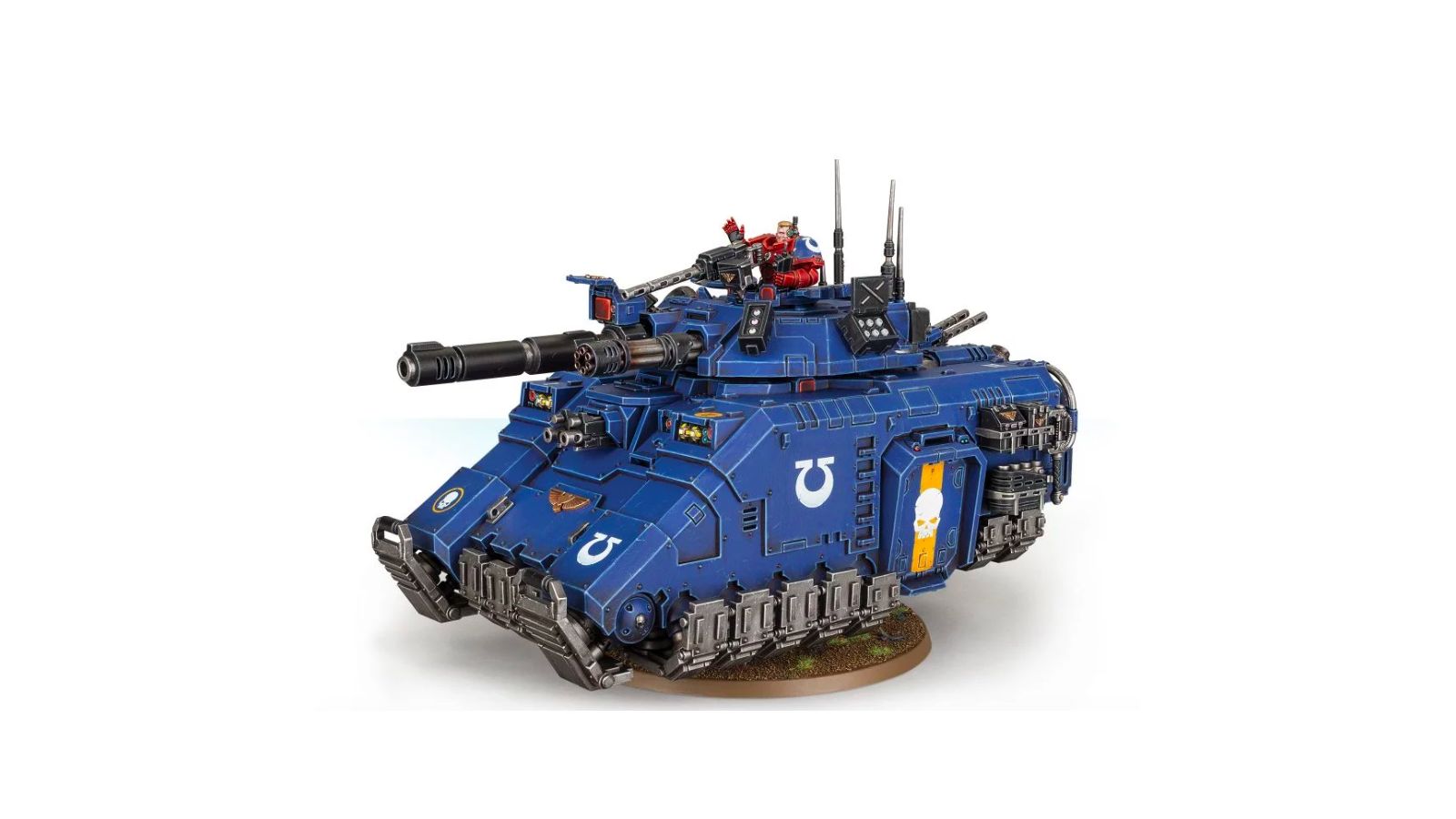 Ce kit plastique est fourni en 150 composants. On peut l'assembler avec ou sans artilleur, et celui-ci peut être représenté en train de consulter un auspex ou d'êttre prêt à actionner la détente de la mitrailleuse Ironhail sur pivot. Il y a aussi huit éléments de rangement optionnels et deux antennes pour décorer le véhicule à votre guise. Le kit est fourni avec un socle rond Citadel de 100mm et une tige transparente, qui permet d'incliner votre figurine pour lui donner un air plus dynamique.